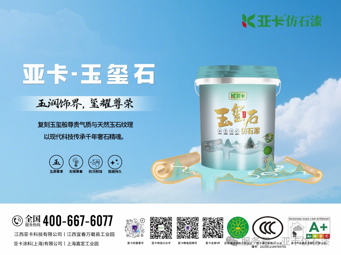 亞卡在產(chǎn)品研發(fā)方面聚焦鄉(xiāng)鎮(zhèn)自建房市場,對仿石漆系列產(chǎn)品持續(xù)進(jìn)行更新迭代,突破天然彩砂調(diào)色難題,實現(xiàn)大理石紋理1:1還原,推出高品質(zhì)的亞卡鉑金石仿石漆;順應(yīng)國潮回歸的新時尚,在研發(fā)中融入玉石粉工藝,復(fù)刻故宮城墻質(zhì)感,亞卡玉璽石仿石漆于2025年4月全新推向市場。